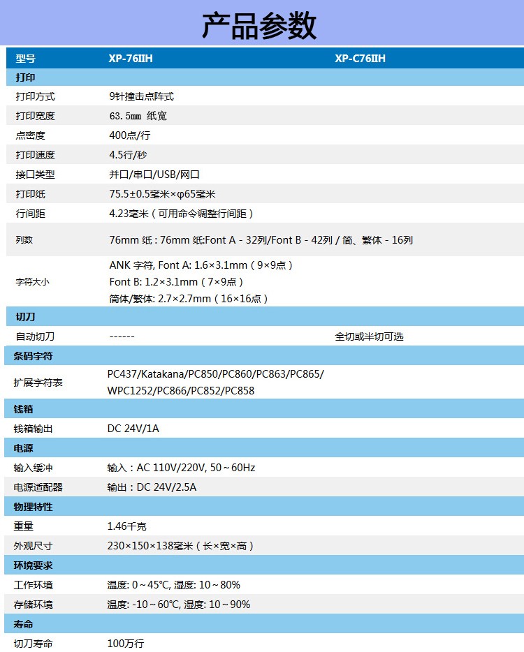 XP-76IIH76毫米针式收银打印机76mm针打发票两三联小票USB接口